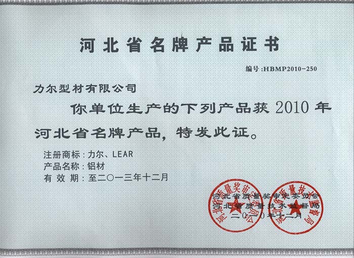 quality technology supervision bureau announced the list of " 2010 Hebei Famous Brand Product". and Lear’s aluminium alloy profile products are awarded "Hebei Famous Brand Product".