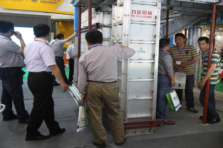 此次博覽會以綠色、節(jié)能、環(huán)保為主題,吸引了專業(yè)觀眾近3000家。力爾鋁業(yè)設(shè)計(jì)開發(fā)的綠色建筑鋁模板,以其優(yōu)良的性能吸引了眾多業(yè)內(nèi)人士爭相垂詢。力爾鋁合金建筑模板系統(tǒng)采用整體擠壓成型的鋁型材加工而成,是新一代綠色施工技術(shù),該系統(tǒng)主要由模板系統(tǒng)、支撐系統(tǒng)、緊固系統(tǒng)、附件系統(tǒng)構(gòu)成,可廣泛應(yīng)用于鋼筋混凝土建筑結(jié)構(gòu)的各個(gè)領(lǐng)域。整個(gè)系統(tǒng)標(biāo)準(zhǔn)化程度高、配合精度高、重量輕、承載力強(qiáng)、板面大、拼縫少、穩(wěn)定性好、拆裝靈活、周轉(zhuǎn)次數(shù)多、施工周期短、使用壽命長、可循環(huán)使用、施工現(xiàn)場安全整潔?;炷翝沧⑼瓿珊蟊砻嫫秸鉂崱⑹┕C(jī)械依賴程度低、能降低人工和材料成本、維護(hù)費(fèi)用低、施工效率高、經(jīng)濟(jì)效益好、回收價(jià)值高等特點(diǎn),符合國家低碳減排等優(yōu)點(diǎn)。聽完我公司技術(shù)人員的講解后,紛紛表示要親自到公司實(shí)地考察,以期建立長期合作關(guān)系。